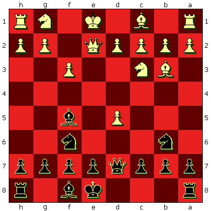 1. e4 d5 2. exd5 Sf6 3. Lb5+ Ld7 4. Lc4 Lg4 5. f3 Lf5 6. Sc3 Sbd7 7. De2 Sb6 8. Lb3 Dd7 (8. ... Sbxd5 scheitert an 9. Sxd5 Sxd5 10. Db5+ )