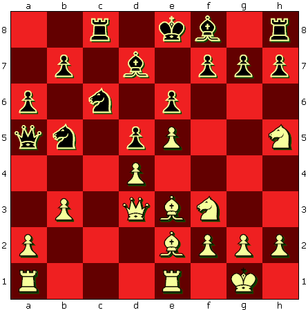9. b3 d5 10. Le2 Sb5 11. Le3 a6 12. Ld3 Ld7 13. Sbd2 Tc8 14. Sf1 Sba7 15. Sg3 Da5 16. Sh5 cxd4 17. cxd4 {jetzt gewinnt Schwarz einen Turm für einen Springer, die Qualität}