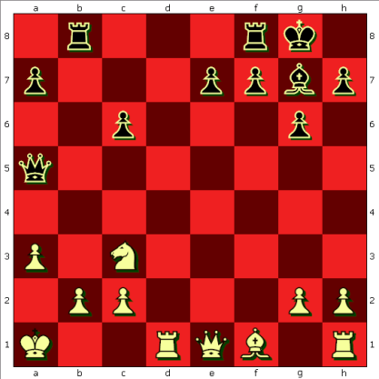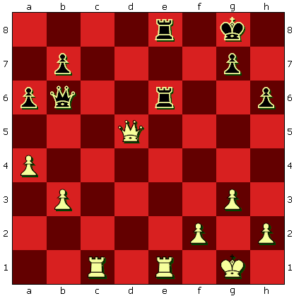 Kontrolle: LösungMit dem Opferzug 1. T3-g8+! nutzte sie die schwarze Grundlinienschwäche aus. Es folgt 1. ... Kh8xg8 2. De4-g2+ Te4-g4 (auf 2. Kh8 oder Kf8 folgt Dg2-g7 matt) 3. Dg2-a8+ nebst Matt im nächsten Zug. |