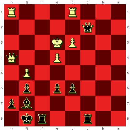 Kontrolle: Lösung1. ... Dg3xh3+! Weiß nahm nun im Eifer des Blitzgefechts mit 2. gxh3 die Dame und wurde mit 2. ... Td3xh3+ 3. Sg4-h2 Td2xh2# mattgesetzt. Er hätte sich mit dem Bauernverlust abfinden müssen und mit 2. Sg4-h2 den König decken müssen. Seine Aussichten wären allerdings angesichts zweier schwarzer Mehrbauern und schwarzer Angriffsstellung nicht rosig gewesen. |
