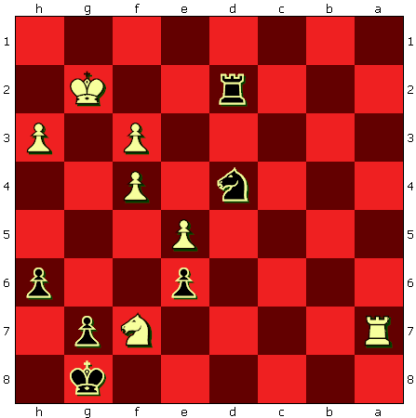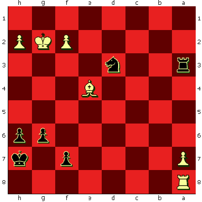 Kontrolle: LösungMit 1. K2-g3 läuft der weiße König geradewegs in ein Mattnetz. Es folgt 1. ... Sd4-f5+ 2. Kg3-g4 Td2-g2+ 3. Kg4-h5 g7-g6 Matt |