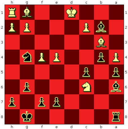 Kontrolle: LösungSchwarz bekommt seinen Einsatz mit Zinsen zurück, wenn er ein weiteres Opfer nicht scheut: 1. ... Tb8xb2! Nach 2. Ka1xb2 Tf8xb8+ 3. Kb2-a2 Lg7xc3 ist gegen die schwarzen Mattdrohungen, verbunden mit dem Angriff auf die Dame, kein Kraut mehr gewachsen. Schwarz versuchte noch 4. Td1-d8x Tb8xd8 5. Dd1-b1, gab jedoch nach 5. ... Td8-d4 6. Db1-b8+ Kg8-g7 auf. Es droht Td4-b4. |