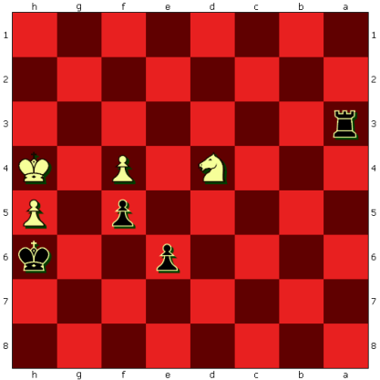 Kontrolle: LösungNach 2. Sd4xf5+ muss Schwarz den frechen Springer schlagen, sonst verliert er den Turm. Nach 2. ... e6xf5 ist es jedoch Patt und Remis. |