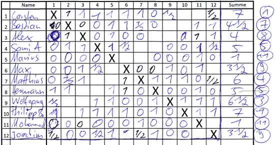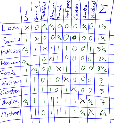Es spielt jeder gegen jeden. Der Spielabend endet jedoch auf jeden Fall um 22:00 Uhr, mit Rücksicht auf die Jugendlichen. Jugendliche, die nicht von ihren Eltern abgeholt werden, werden von erwachsenen Vereinsmitgliedern nach Hause gefahren. Endet ein Spielabend, ohne dass alle Begegnungen gespielt sind, so zählt der Stand zu diesem Zeitpunkt als Ergebnis des Abends.