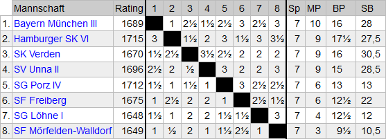 Es ging gegen den Schachverein Unna, der mit Ambitionen gegen uns antrat. Mit einem klaren Sieg gegen uns hätten sie die führende Mannschaft von Bayern München überflügeln und den Gruppensieg erringen können. Dem setzte jedoch Jan Reimer einen Dämpfer. Er überspielte seinen Gegner und errang einen nie gefährdeten Sieg, so dass der erste Punkt an uns ging. Die Unnaer glichen aus, als Alexander Widmaier seine Bedenkzeit überzog und somit verlor. Er war zu diesem Zeitpunkt jedoch schon so weit ins Hintertreffen geraten, dass seine Partie nur durch einen groben Fehler des Gegners noch zu retten gewesen wäre.