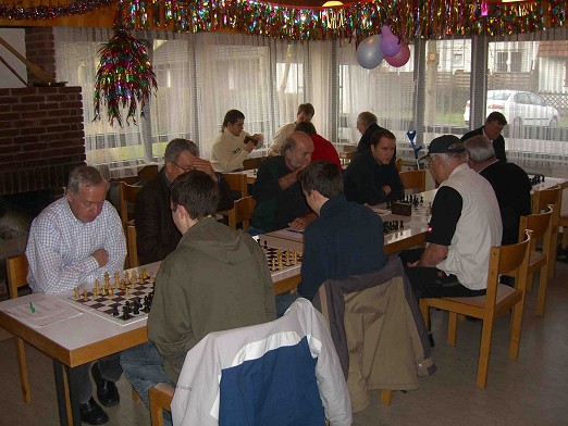 Erfreulich war dann, dass Hans Mayer, unser stets souveräner, zuverlässigster Spieler, das Spiel mit einem Remis beenden konnte. Kurz darauf folgte ein Remis durch Christian Obergfäll, der das sich ganze Spiel hindurch in einer besseren Stellung befunden hatte, den entscheidenden Gewinnzug jedoch übersah und sich deshalb mit einem halben Punkt zufrieden geben musste.