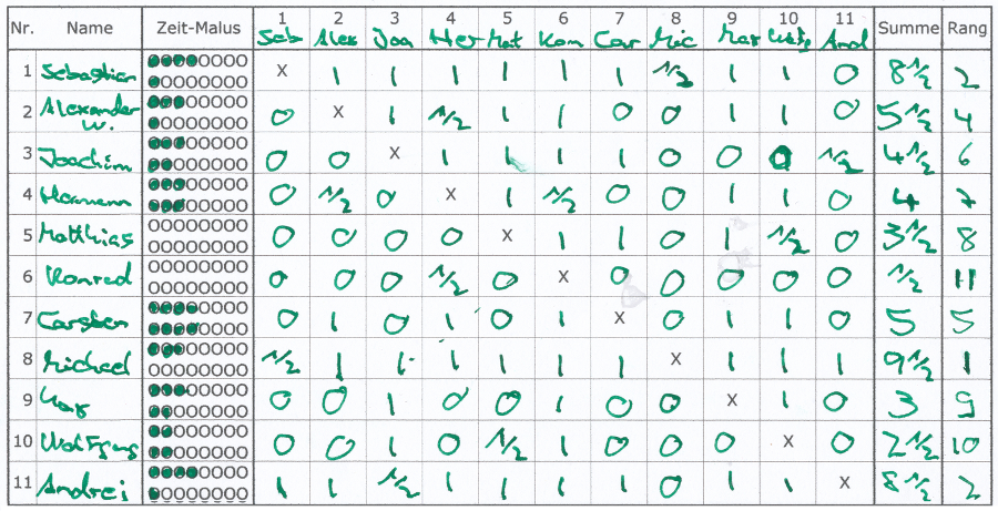 So entschieden wir uns für ein Blitzturnier mit Handicap. In der ersten Runde hatte jeder fünf Minuten Bedenkzeit für die Partie. Wer eine Partie gewann, bekam in der nächsten Runde eine Minute Bedenkzeit abgezogen. Das konnte hinuntergehen bis auf zwei Minuten, wenn jemand drei- oder noch mehrmal hintereinander gewann.